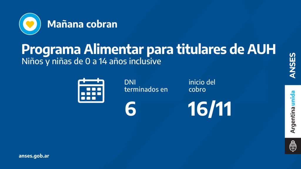 A partir de este mes, el programa Alimentar se deposita en la misma cuenta y en la misma fecha que la AUH. Esta unificación permite una mejor organización y da mayor previsibilidad a las familias que ahora podrán buscar la mejor calidad y el mejor precio de sus alimentos. Mañana cobran titulares con documentos concluidos en 6.
