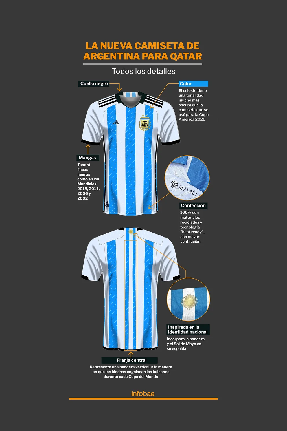 La base es tradicional y el escudo se mantiene igual. En una inspiración en la identidad nacional, transmite la emoción única que genera el fútbol en el país. Aunque hay un cambio radical en la espalda y en la mitad donde no está el bastón del medio y fue reemplazado por la bandera en sentido vertical, que recuerda la manera como los hinchas cuelgan el símbolo patrio de su país en los balcones durante cada Copa Mundial; y por el otro, incorpora el Sol de Mayo -otro de sus emblemas nacionales-en la parte posterior del cuello.