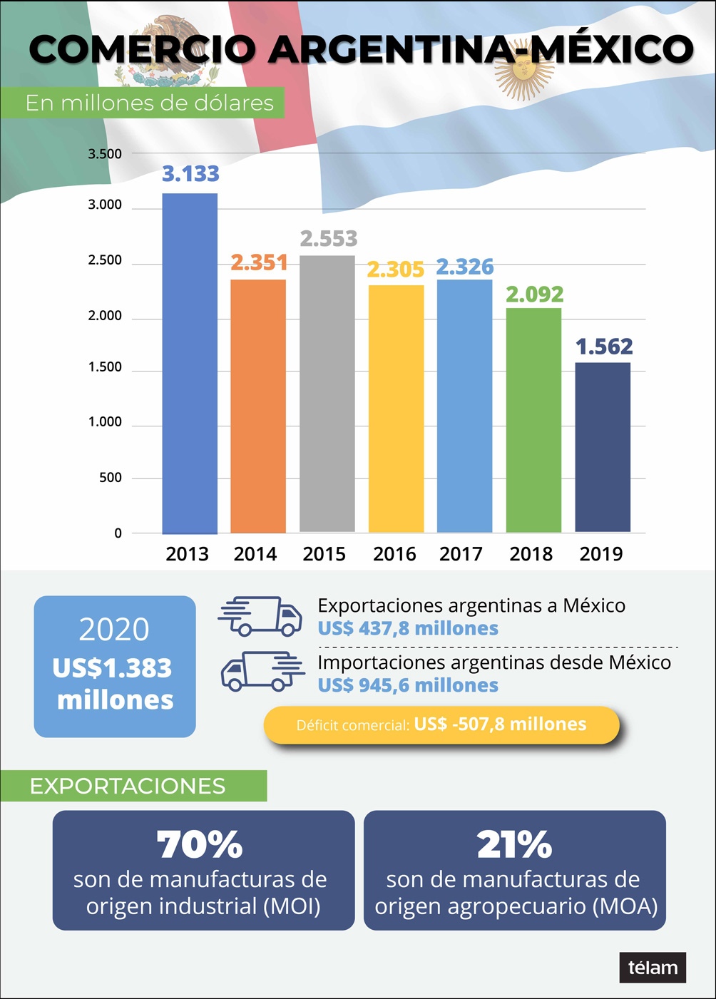 La visita oficial que encabeza el presidente Alberto Fernández a México tendrá un capítulo comercial en el que se buscará revitalizar el intercambio bilateral, que refleja un gradual deterioro desde 2013, y a la vez equilibrar el déficit para la Argentina, que en 2020 alcanzó los US$ 507 millones.