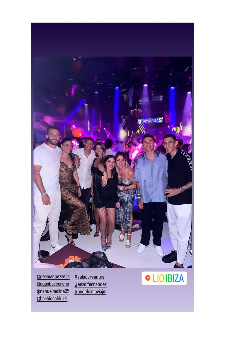 Los primeros en encontrarse fueron Fideo, Molina, Fernández y Pezzella en el popular club nocturno de la isla balear llamado “Lío Ibiza”. Los cuatro estuvieron acompañados por sus respectivas parejas Jorgelina Cardoso, Bárbara Occhiuzzi, Valentina Cervantes y Agustina Bascerano.