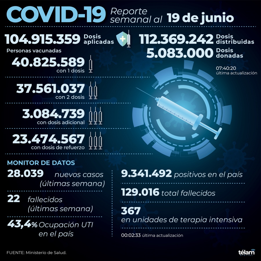 Según el Monitor Público de Vacunación, el total de dosis aplicadas asciende a 104.915.359, de los cuales 40.825.589 recibieron una dosis, 37.561.037 las dos, 3.084.739 una adicional y 23.474.567 una de refuerzo, mientras que las vacunas distribuidas a las jurisdicciones llegan a 112.369.242 y las donadas a 5.083.000.