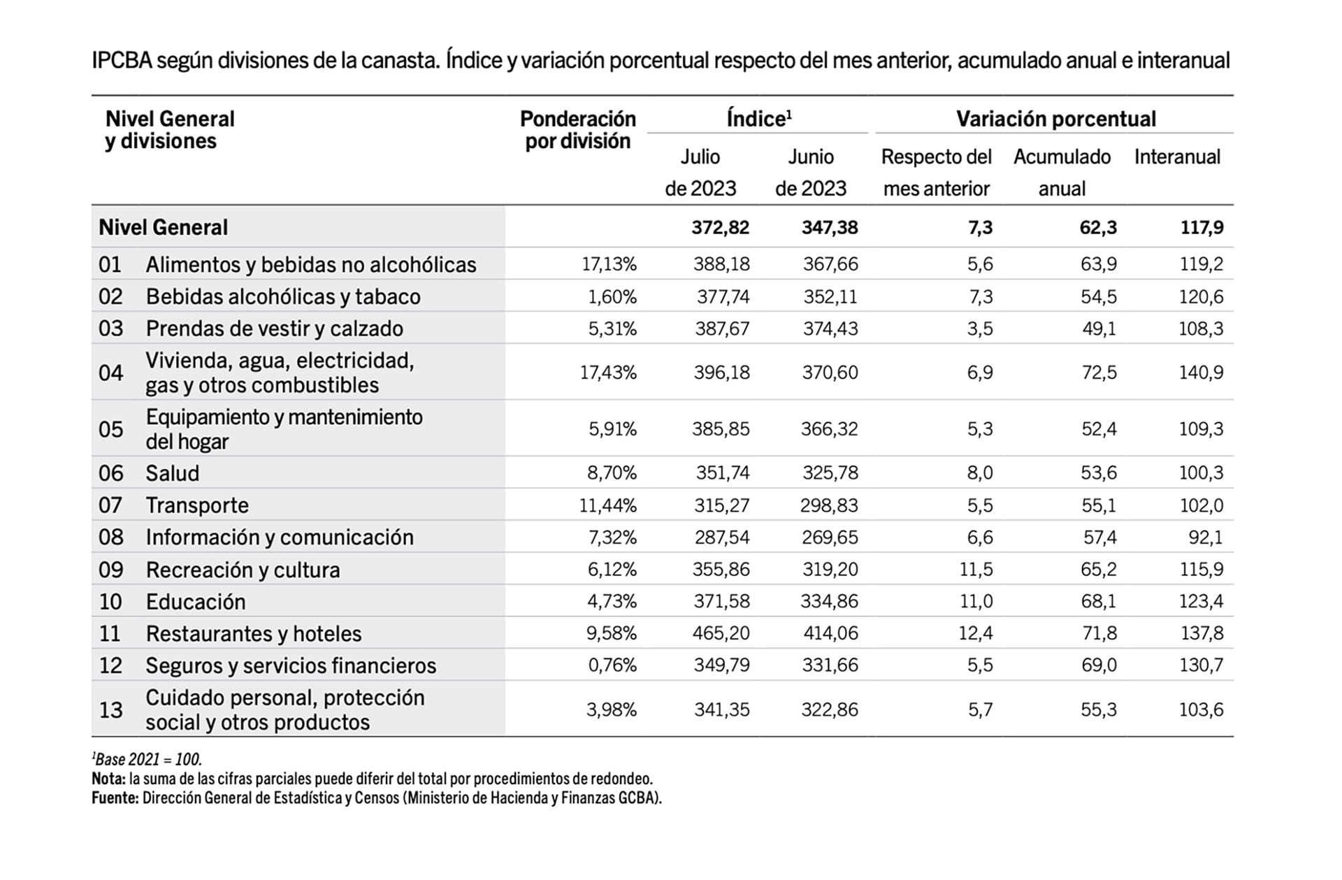 “Durante el mes de julio el Índice de Precios al Consumidor de la Ciudad de Buenos Aires (IPCBA – base 2021 = 100)1 registró un incremento de 7,3%, acumulando en los primeros siete meses del año una suba de 62,3%. La trayectoria interanual -i.a- de este indicador se ubicó en 117,9% (-0,7 puntos porcentuales -p.p.- por debajo del mes previo)”, indicó el organismo.