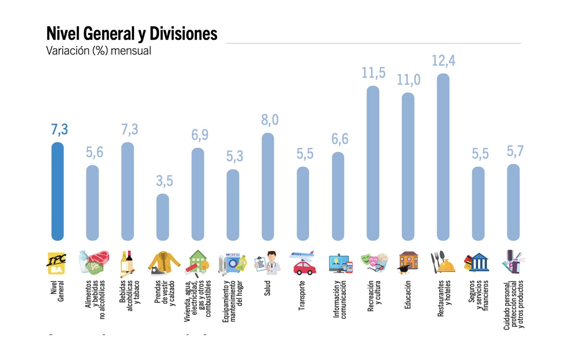 El mes pasado la variación del IPCBA “respondió fundamentalmente a las subas en las siguientes divisiones: Restaurantes y hoteles, Vivienda, agua, electricidad, gas y otros combustibles, Alimentos y bebidas no alcohólicas, Salud y Recreación y cultura, que en conjunto explicaron el 68,3% del alza del Nivel General”.