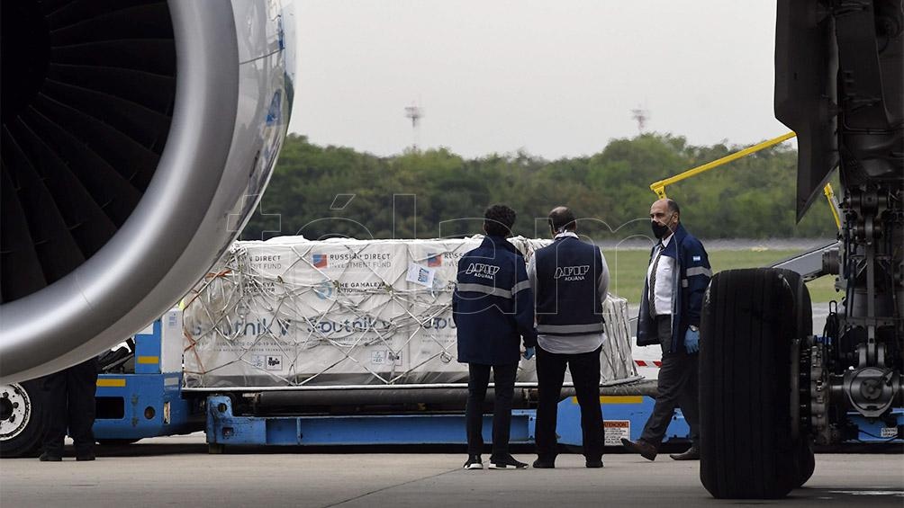 Un vuelo de Aerolíneas Argentinas aterrizó el jueves en Ezeiza con su carga de 240 mil dosis, 20 mil de las cuales fueron derivadas a Bolivia. El resto se repartirán según el mismo cociente de distribución que se utilizó con las dos partidas anteriores traídas desde Moscú.