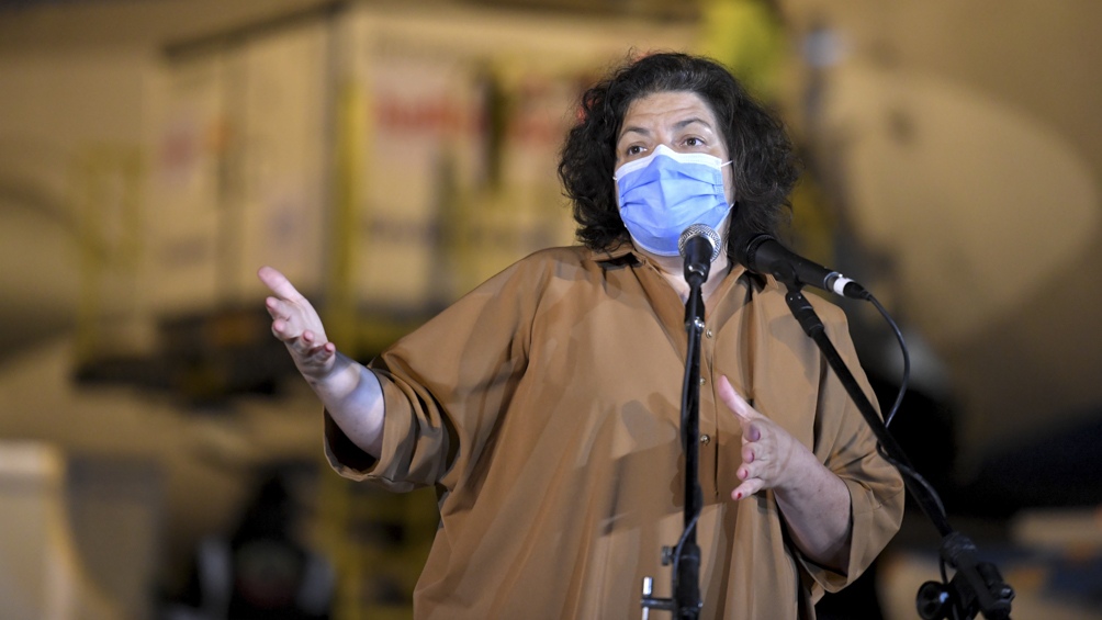 Vizzotti arribó a Ezeiza a bordo del avión de Aerolíneas Argentinas que trajo desde China 768.000 dosis de Sinopharm. Subió a ese vuelo en Madrid, donde el aparato hizo una escala técnica.